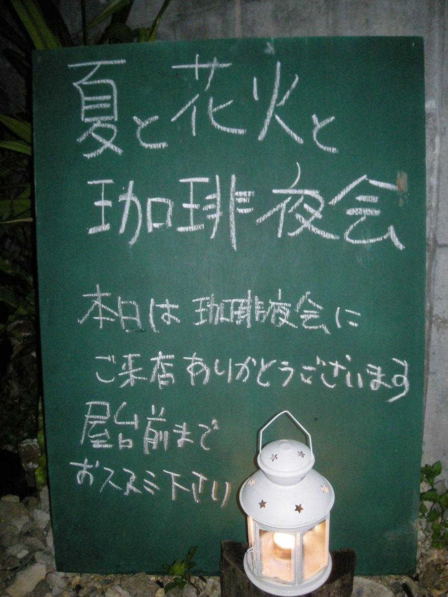 2度目は2年前の夏。ひばり屋さんのお庭で屋台デュオ「夏と花火と珈琲夜会」をやりました〜。珈琲飲み比べセットに、線香花火をつけて。途中雨が降ったりもしたけれど、テンションも高く、とても楽しく無事イベント開催できました。