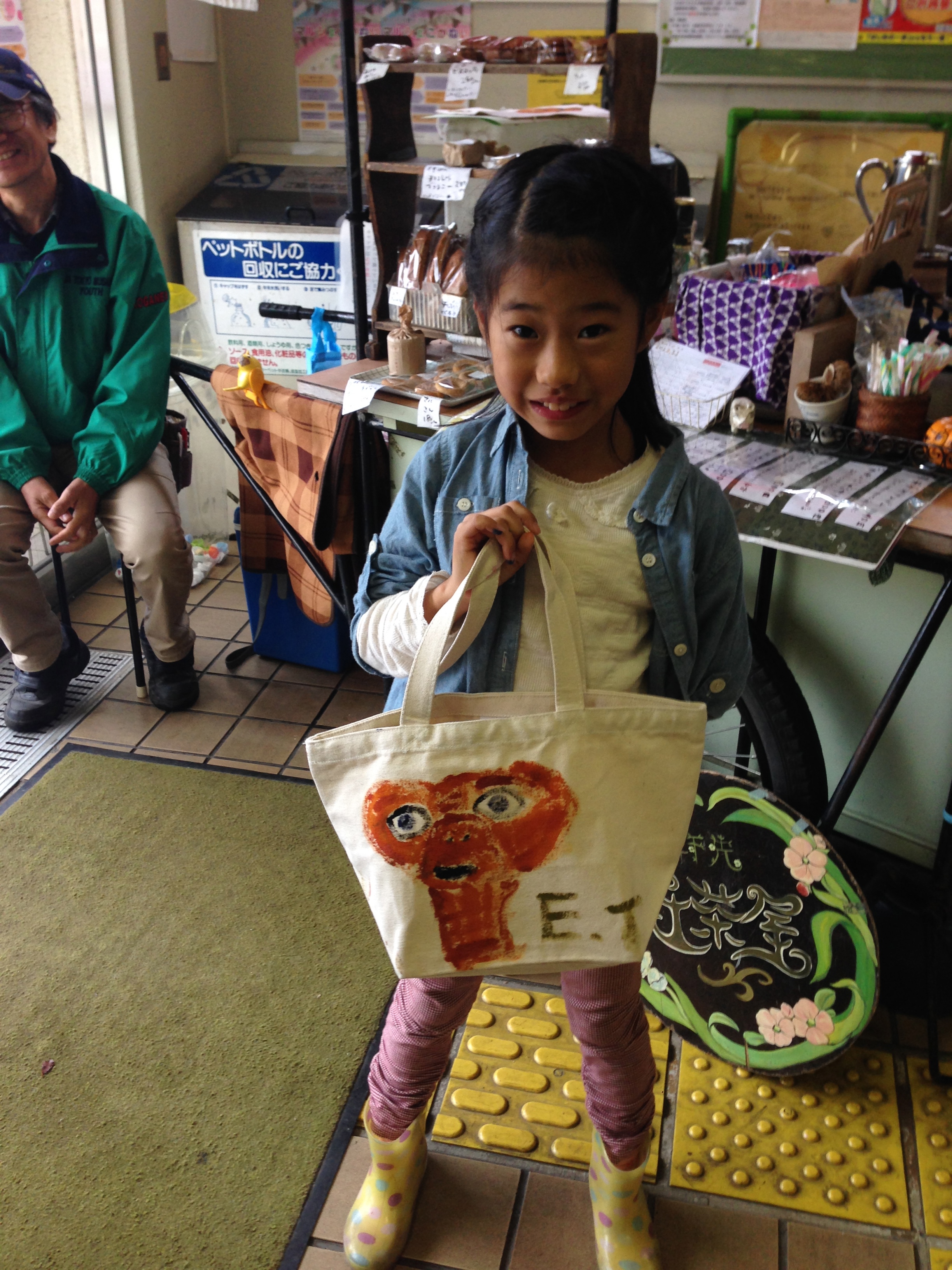 きっとはるちゃんの頭はE.T.一色。その土曜日の消費生活展での『エコバックに絵を描こう』に参加したはるちゃん。