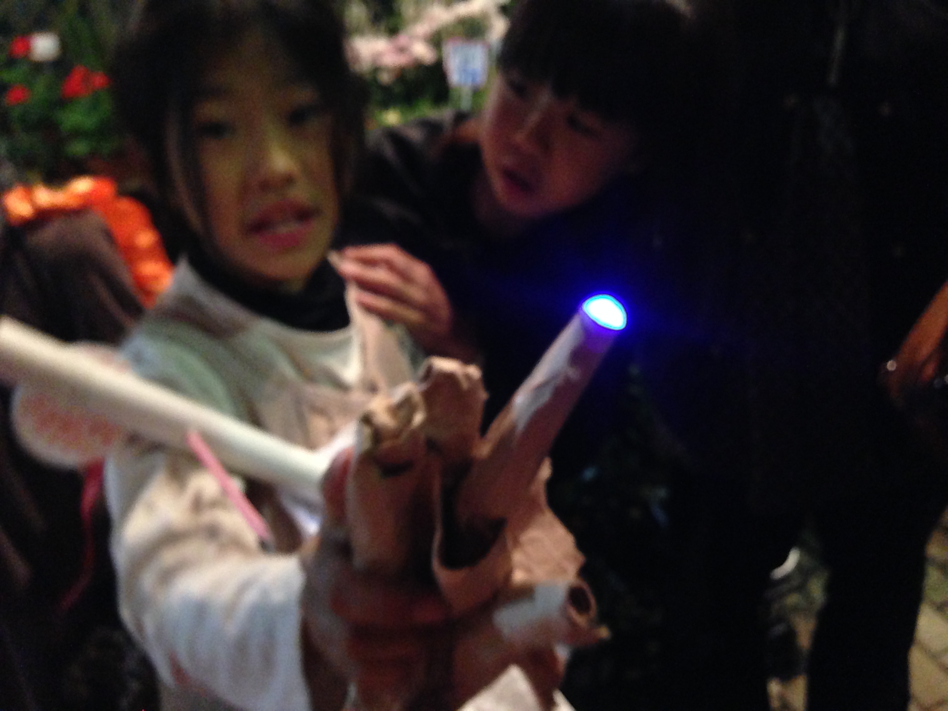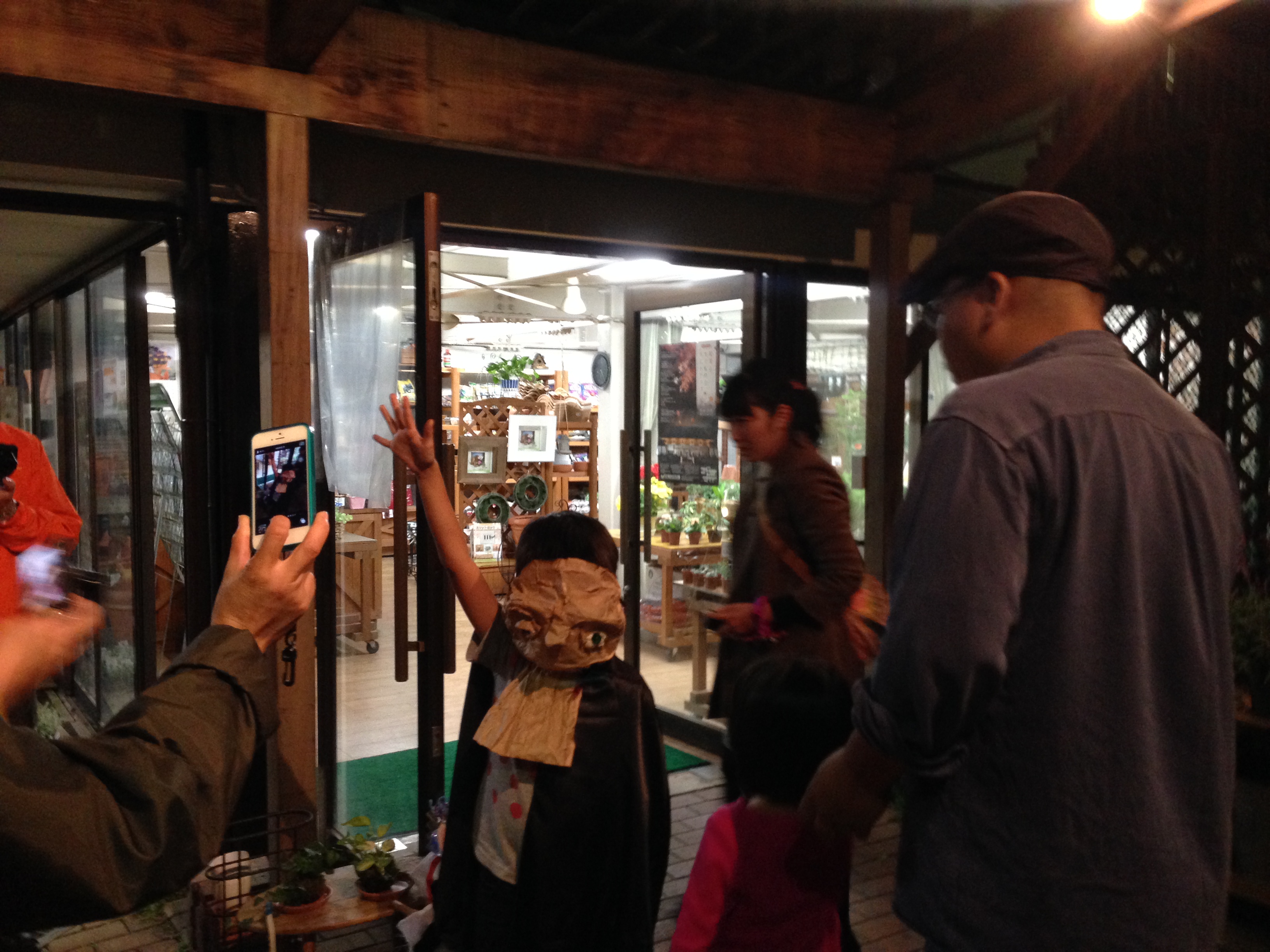 このE.T.、さかのぼってハロウィン1週前の水曜日、毎年とーっても楽しみにしているはるちゃんは、何の仮装か決めかねていて真剣に悩んで居ました。あーだこーだ話している内にこれだ!っとE.T.に決まったものの、どうやって作るか今度はまた考え考え。紙袋がいいんじゃない、とか茶色いタイツとかこちらは楽しく、はるちゃんは不安な顔でw相談したのです。翌木曜日、ことり焼菓子店のビスコッティ納品の時の紙袋をはるちゃんに託しました。その晩、はるちゃんとちょっとお手伝いのママ。超集中して作ったそうです。