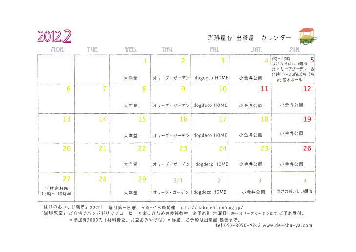 2月のカレンダー 2月のカレンダーを更新しました。 寒い冬。 澄み渡る空の下、火鉢と珈琲をお楽しみ下さい〜。 カレンダー日々のこと 2012 年 1 月 30 日出茶屋リンクURL コメントを残す この記事を共有する → Tweet Pin It
