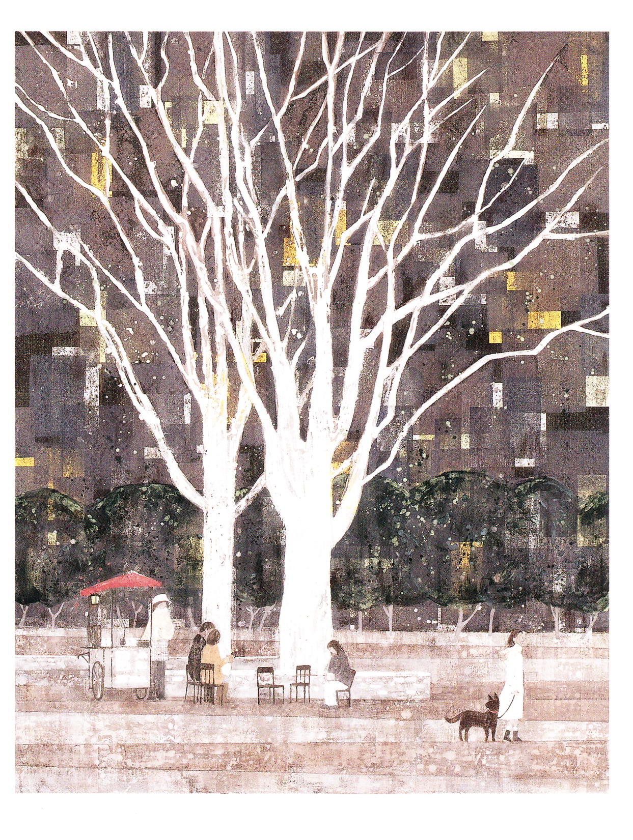 絵葉書になった作品の入った封筒を頂き、半分くらい取り出すと、日本画の淡い色合いで描かれた情緒的な冬の木々と空、わぁステキ!