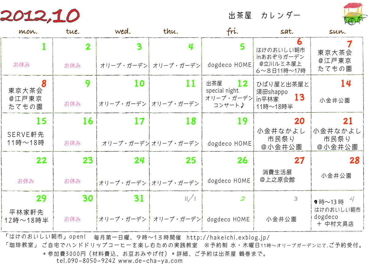 10月のカレンダー 出茶屋10月の出店カレンダーを更新しました。 一気に秋が深まりそうです。 10月はお祭り出店がたくさん♪ そして12日(金)は出茶屋special night、オリーブガーデンコンサート♪ 今年もやります! 翌13日(土)には沖縄からひばり屋さんが遊びに来てくれて、一緒に出店します♪ それぞれ詳細はまた後日! 出店mapも、serveさん、平林家の場所も入りました〜。 温かい珈琲がぐっとおいしく感じる季節が来ました。 楽しみー! 出茶屋カレンダーお祭り・イベント、臨時休業等のお知らせ 2012 年 9 月 25 日出茶屋リンクURL コメントを残す この記事を共有する → Tweet Pin It