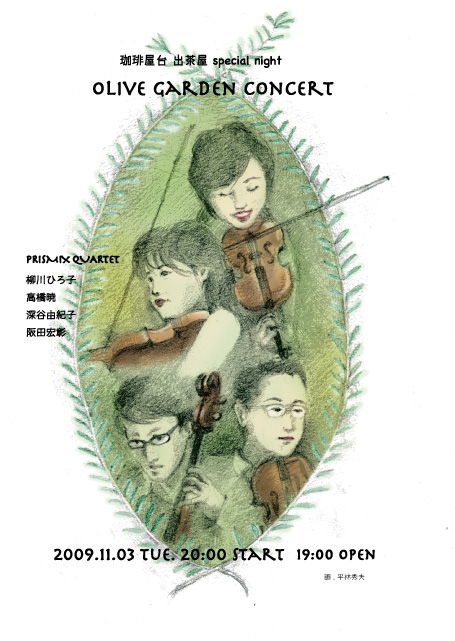 ※コンサートのお問い合わせは、出茶屋 鶴巻まで。(dechaya@gmail.com 当日はオリ−ブ・ガーデンさんにお電話ください。)