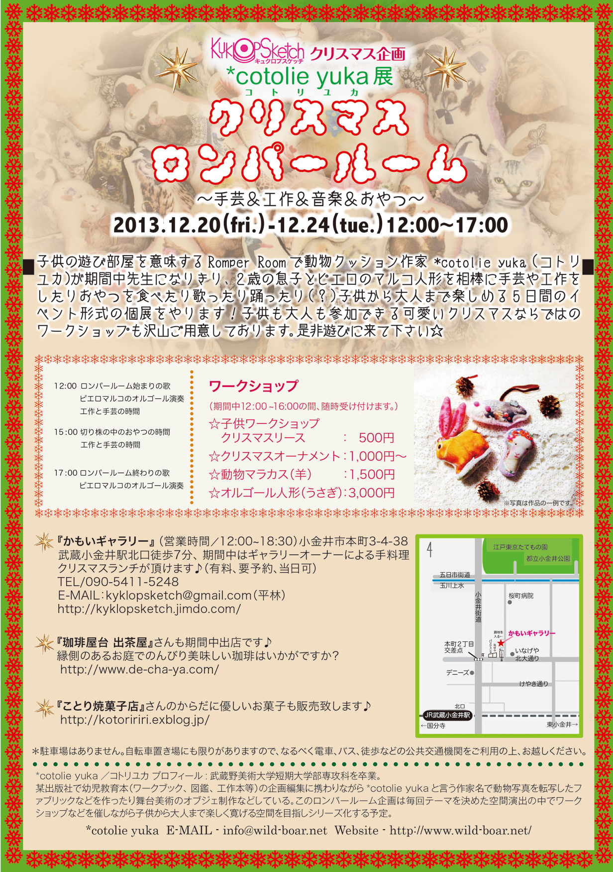 cotolie yuka展 クリスマスロンパールーム! 20日(金)から24日(火)12時から19時(ワークショップは17時まで)平林家でお待ちしてますー! 写真はまた載せていきます! 日々のこと 2013 年 12 月 20 日出茶屋リンクURL コメントを残す この記事を共有する → Tweet Pin It
