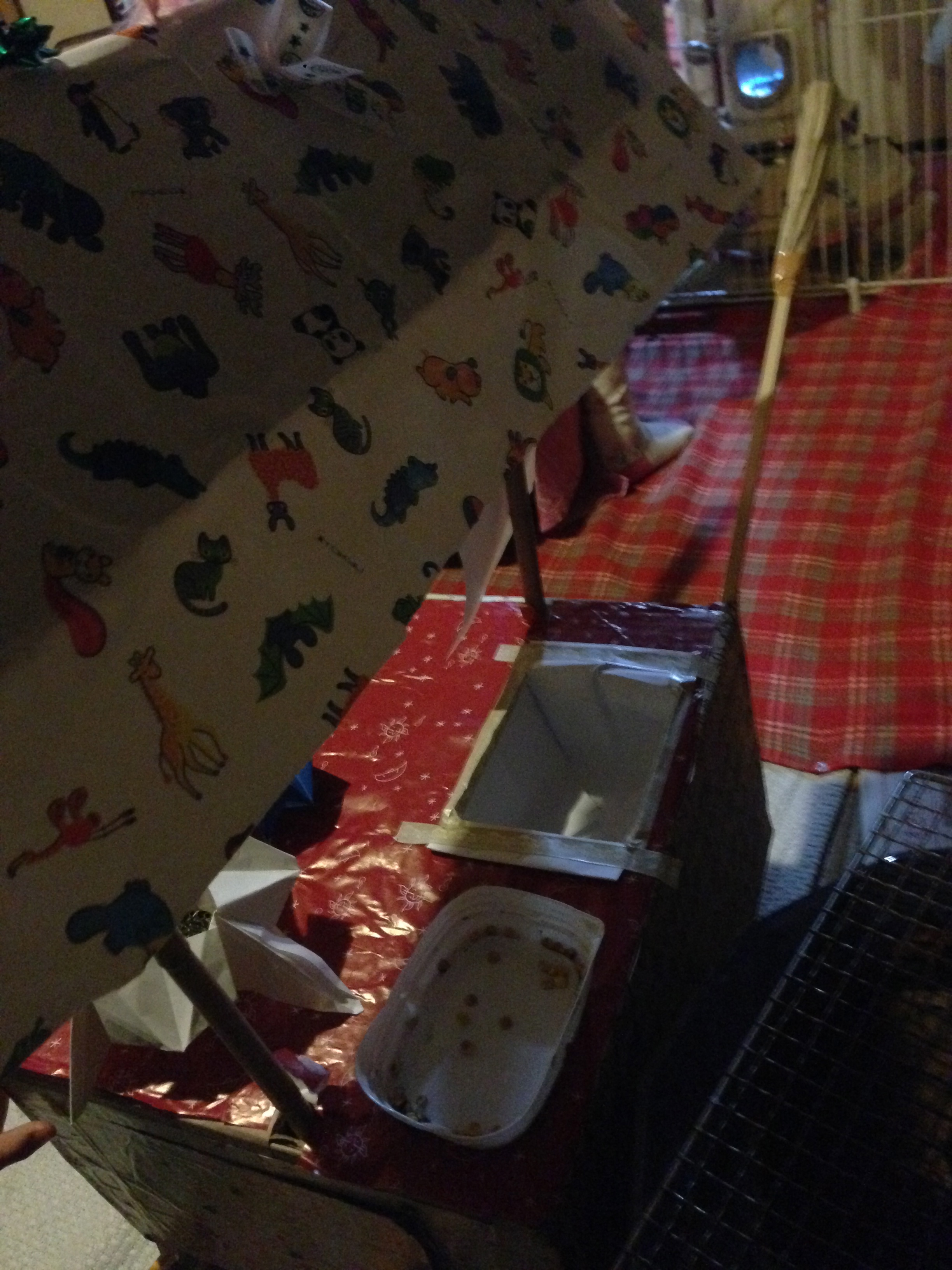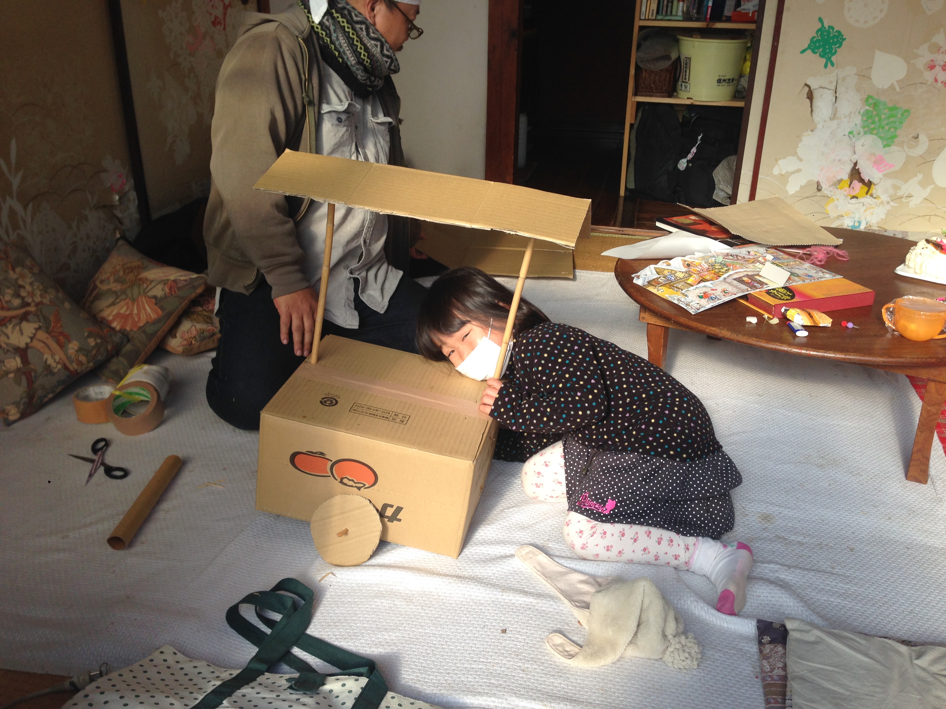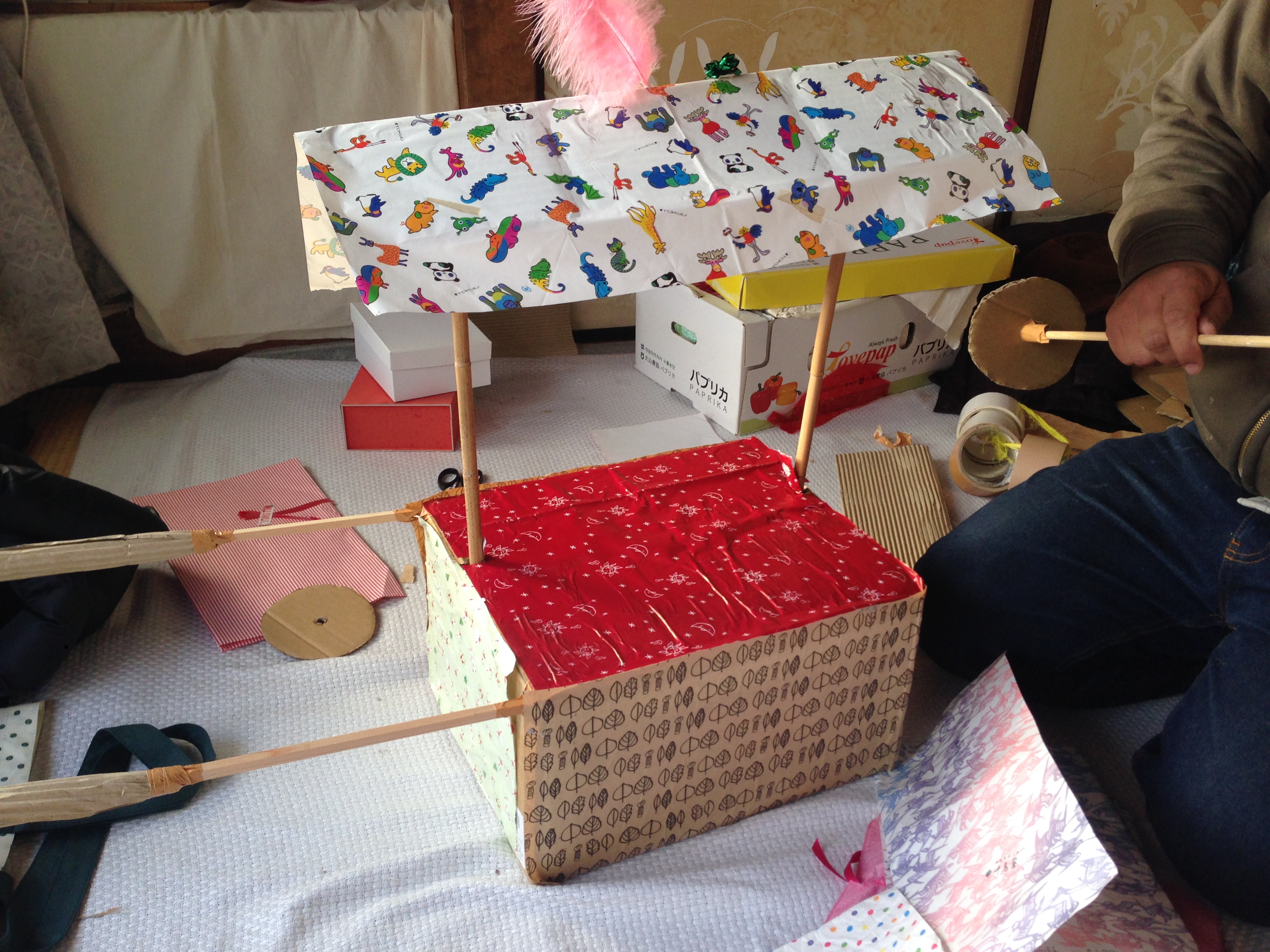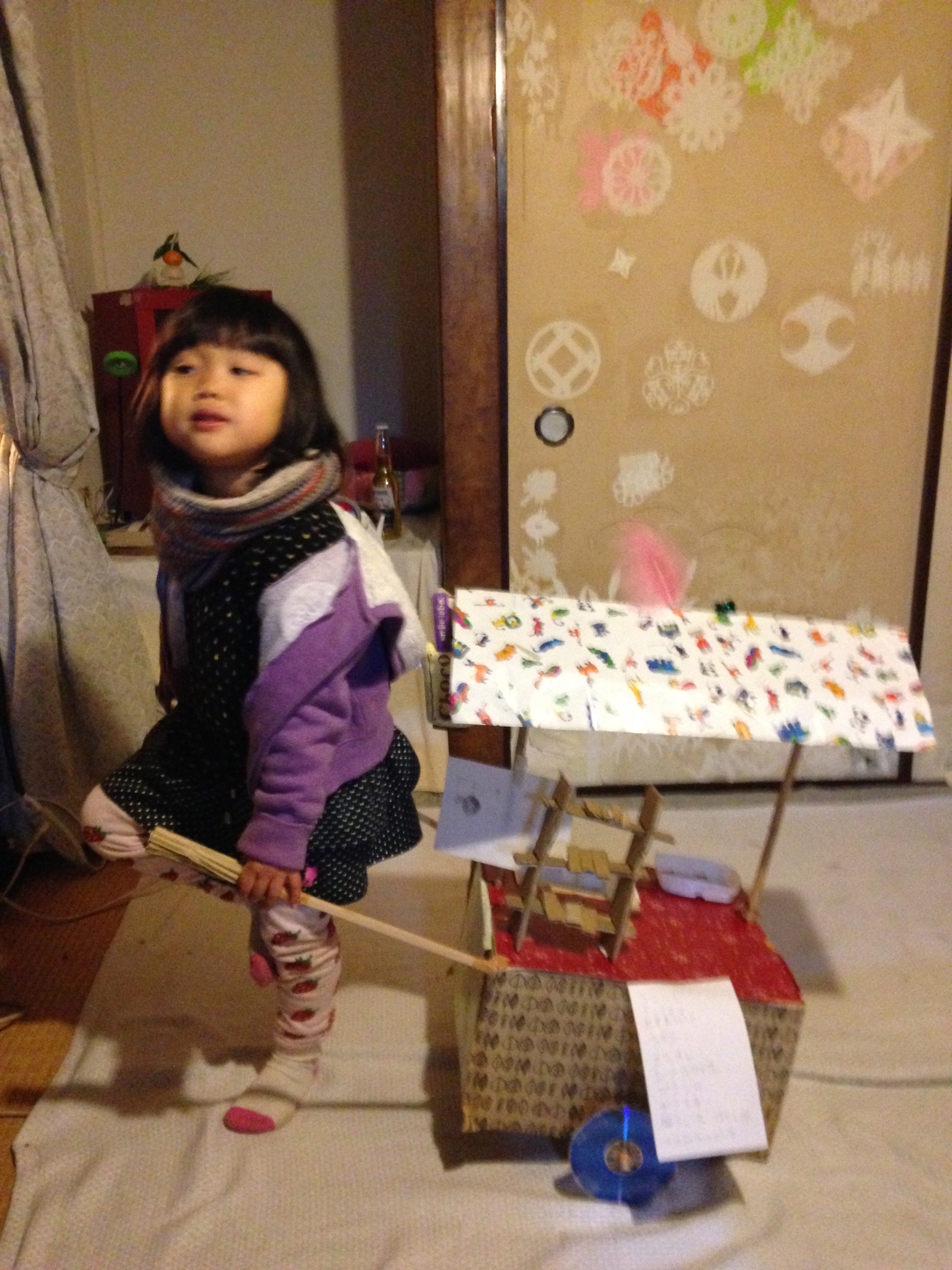 かき段ボールをチョキチョキ、どっからが棒が出て、屋根がついて、車輪もついて、、