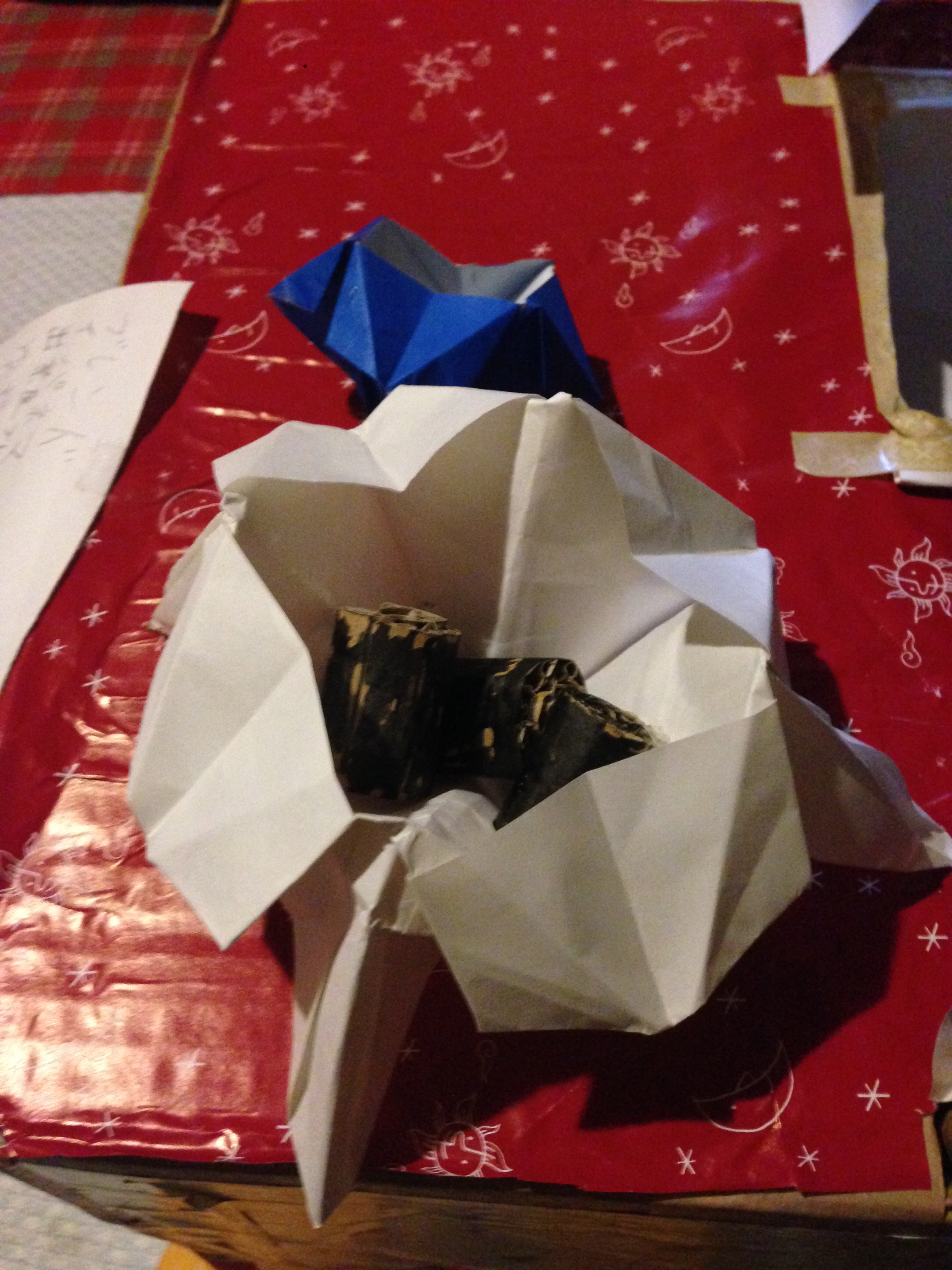メニューを書き、流しを作って、箱にドアが出来て開くようになり、火鉢に炭も紙で作る♪