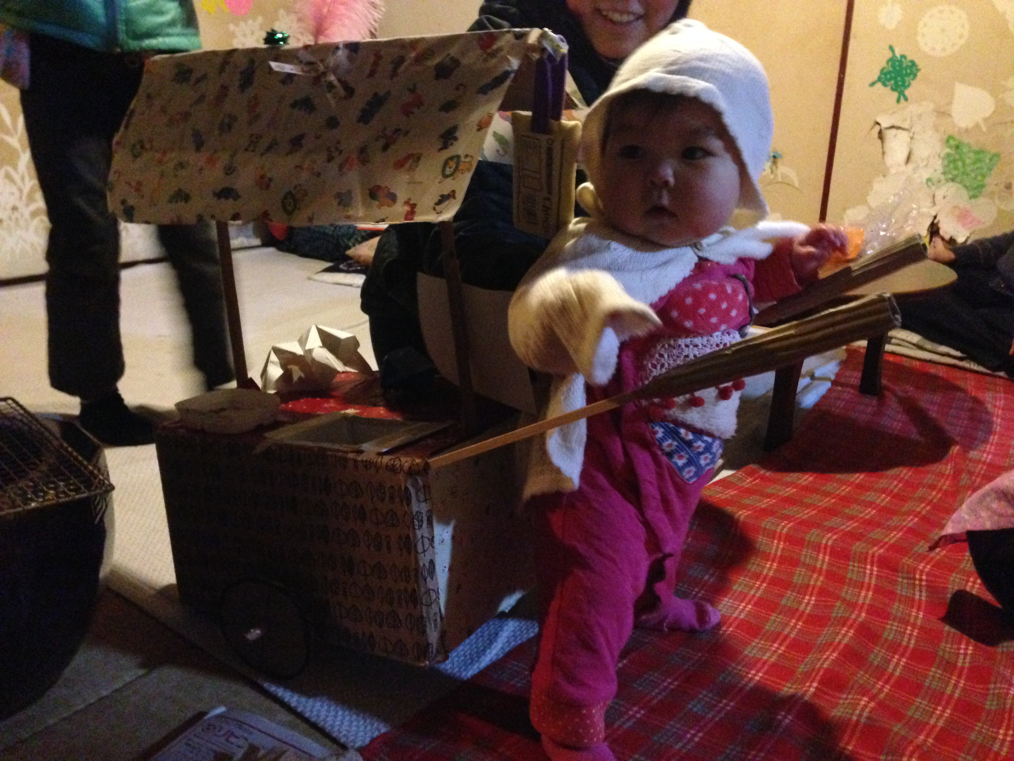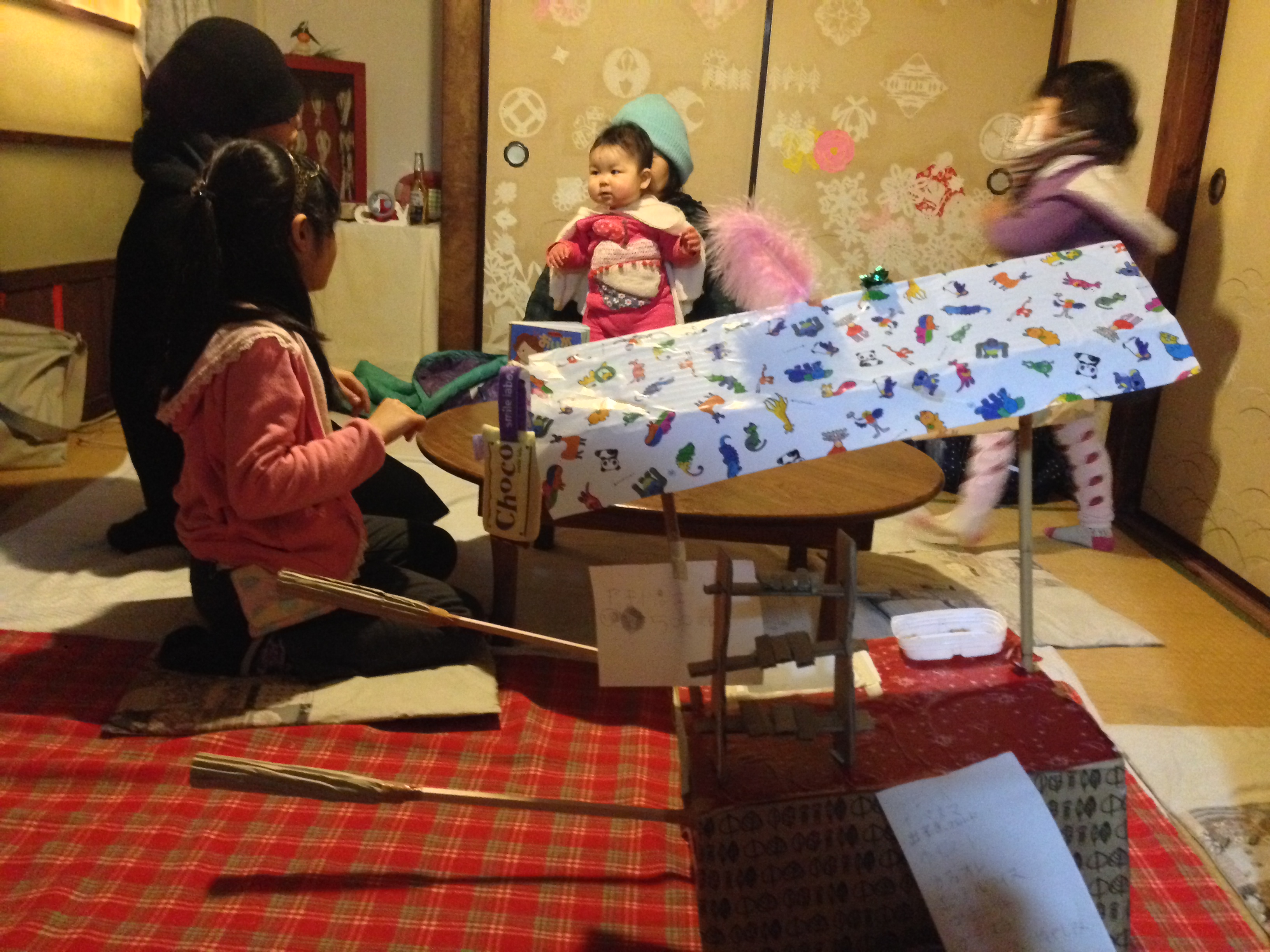 ちゃぶ台をつたえ歩きするいっちゃん♪いちこが歩いてる横で、みんなに手伝ってもらってさらに工作は続きます。