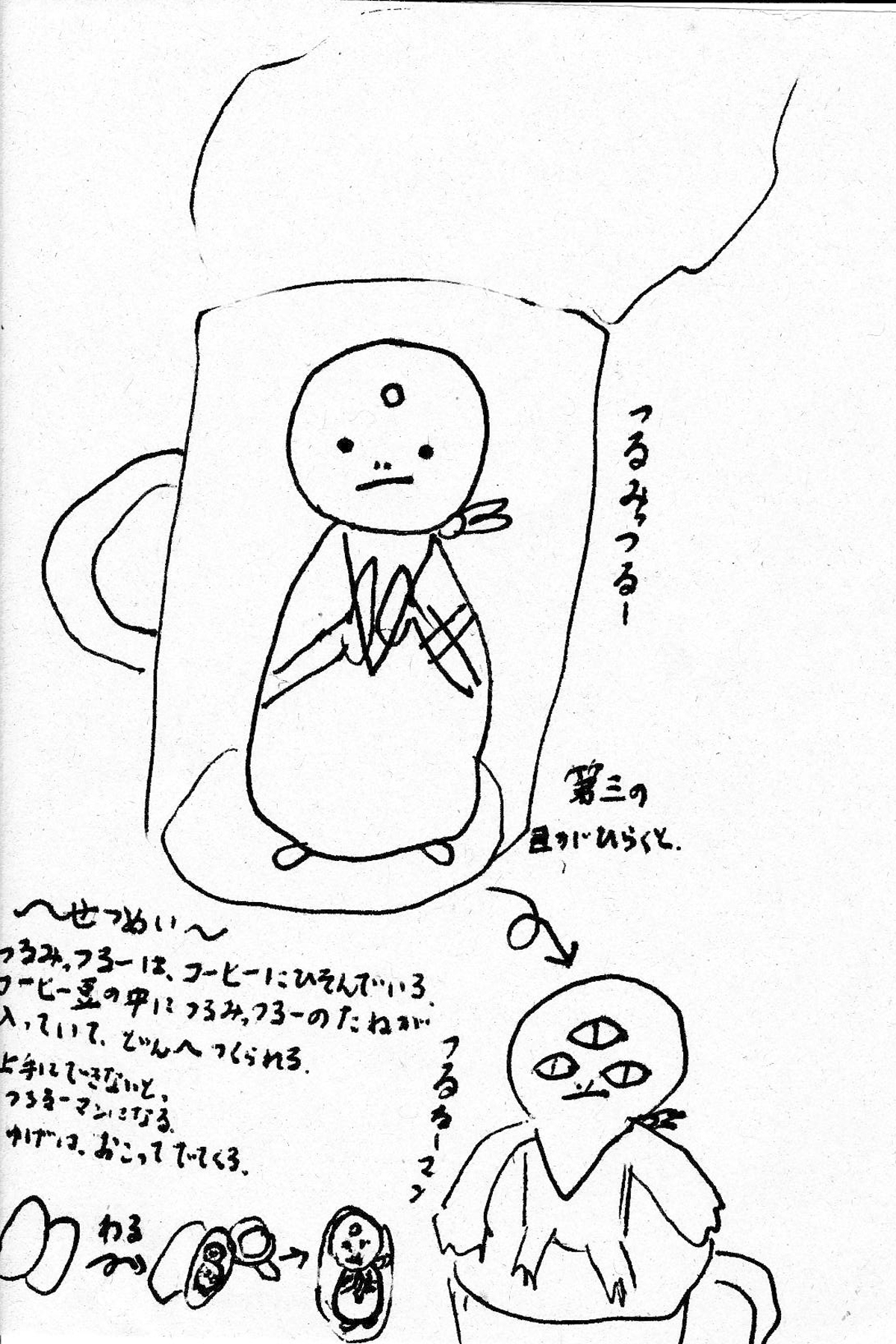 つるみっつる 先週の水曜日は確かお天気もよくて、出茶屋も賑わいました♪ いつのまにかゆるきゃらの話題から、はるちゃんとOさんで出茶屋のゆるきゃらがどうのこうのという話しになっていて、 はるちゃんが生み出してくれました↓ つるみっつるーは、コーヒーにひそんでいる。 コーヒー豆の中につるみっつるーのたねが入っていてい、どんどんつくられる。 上手にできないと、つるるーマンになる。 ゆげはおこってでてくる。 つるるーマンになると、第三の目がひらくそうです。 日々のこと 2015 年 4 月 5 日出茶屋リンクURL コメントを残す この記事を共有する → Tweet Pin It