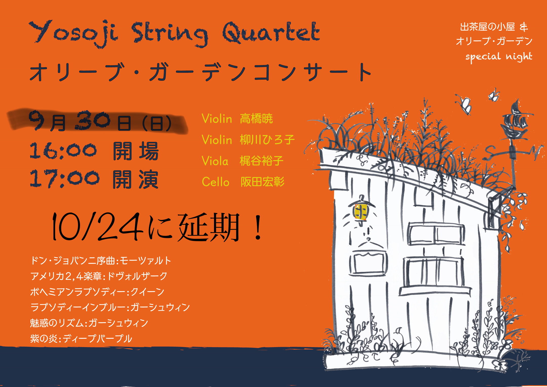 本日は延期になりました、オリーブガーデンコンサートです!