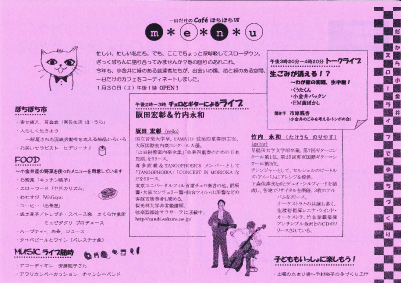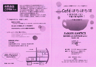 Cafe’ぼちぼちのスタッフの方が、第2回目のオリ−ブガーデンライブを聴きにきてくださっていて、ぜひぼちぼちで、とおっしゃって、阪田さんと竹内さんが、快く受けてくださいました。