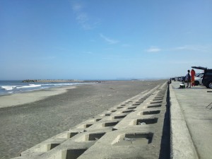 海に近づくと、フェンスがなぎたおされているところがあり、防波堤も工事中だった。