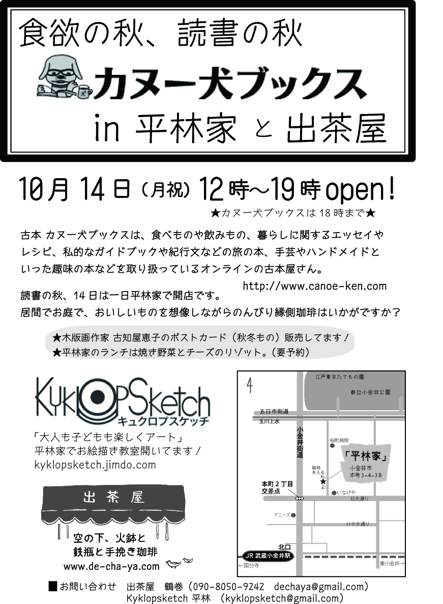 カヌー犬ブックス in 平林家と出茶屋 3連休の最終日、14日(月祝)は、平林家のお庭でopen。 そしてカヌー犬ブックスさんが一日古本屋を平林家でopenします! あの昭和な居間に、どんな本が来るのかな〜♪ 平林さんに作ってもらいたい本探さなきゃな〜♪ 本を読んで旅するのだ〜♪ 12時〜19時(カヌー犬さんは18時まで) 平林さんのご飯は焼き野菜とチーズのリゾット(要予約、当日可)、おいしそー! 月曜日は平林家で、 食欲の秋、読書の秋 カヌー犬ブックス in 平林家 と 出茶屋 のんびりお楽しみください〜。 2013 年 10 月 12 日出茶屋リンクURL コメントを残す