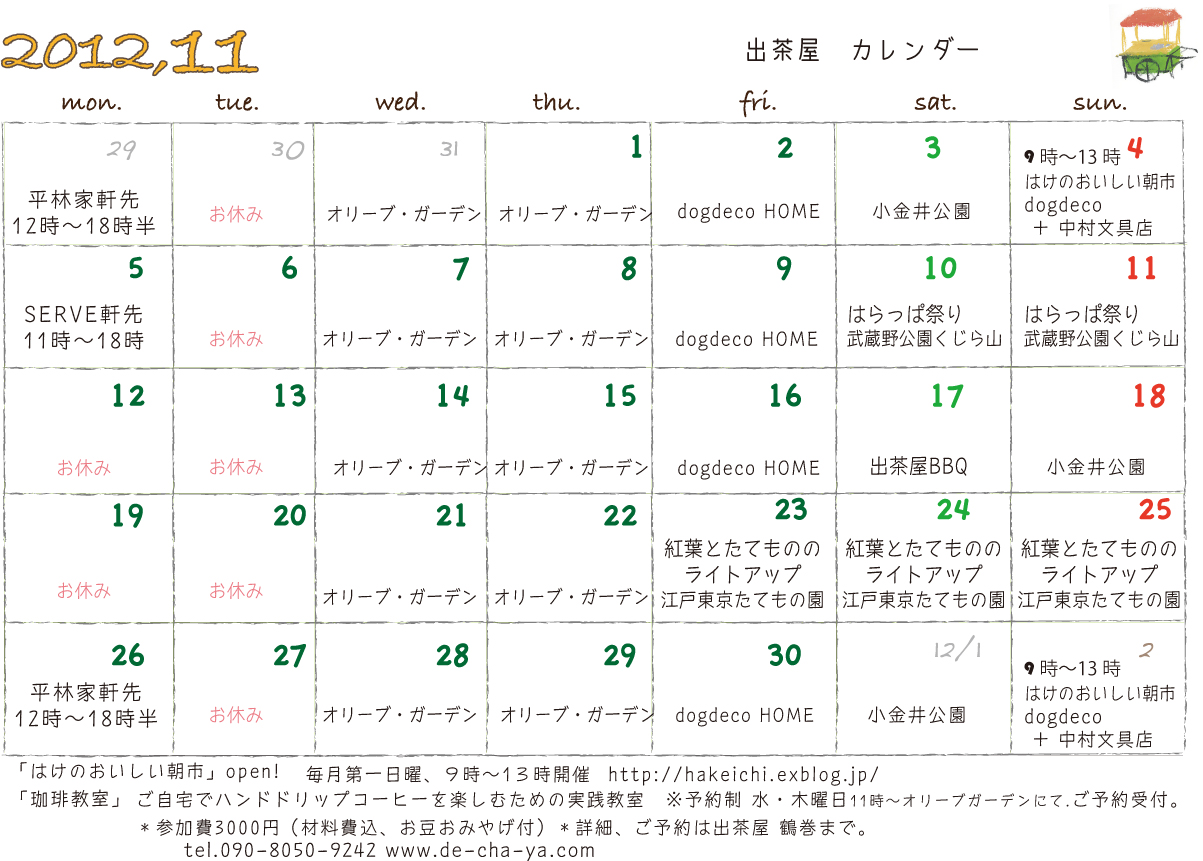 11月のカレンダー 一気に秋も深まってきました。落ち葉がふかふかになっていきますね。 ぐりことちよat小金井公園なかよし市民祭り 11月のカレンダーを更新しました。 武蔵野公園のはらっぱ祭り、 江戸東京たてもの園の紅葉とたてもののライトアップ、と深まる秋のすてきなイベントがありますよー。 楽しみです。 2012 年 10 月 28 日出茶屋リンクURL コメントを残す